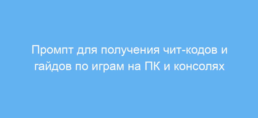 Промпт автоматически подскажет актуальные и полезные данные по введённой игре и платформе. Пользователю достаточно указать название игры и тип устройства — и нейросеть сгенерирует развернутый список чит-кодов и ссылок на соответствующие ресурсы. Это экономит время, избавляя от долгого поиска информации по разным сайтам.
