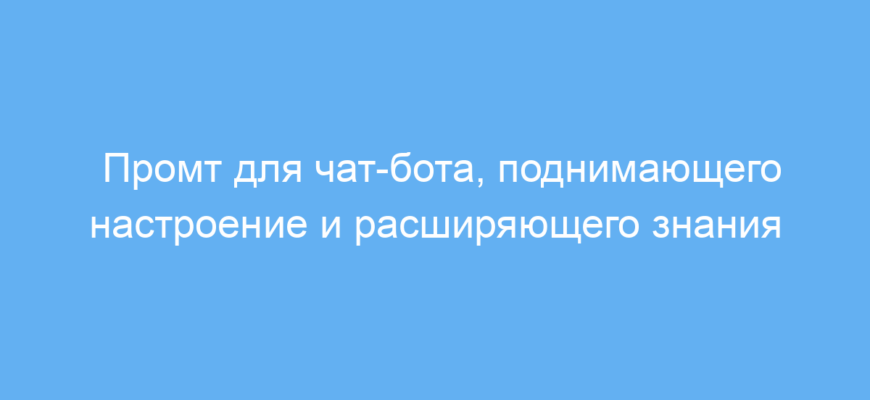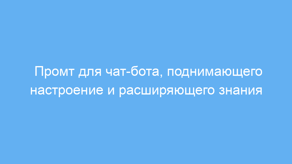 Этот промт предназначен для тех, кто хочет создать дружелюбного и познавательного чат-бота, способного поднимать настроение пользователей. Он идеально подходит для разработчиков, контент-мейкеров и владельцев сайтов, желающих добавить интерактивный элемент с интересными фактами и мотивацией. Промт решает проблему сухих или скучных диалогов, делая общение с нейросетью игривым и полезным.