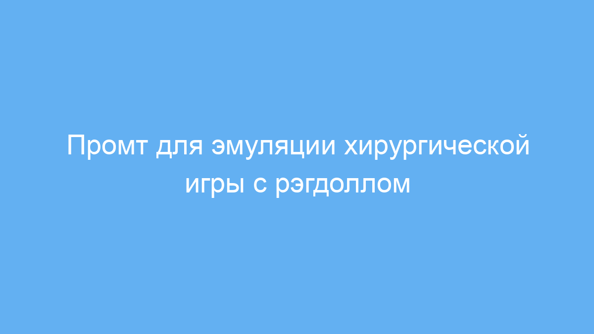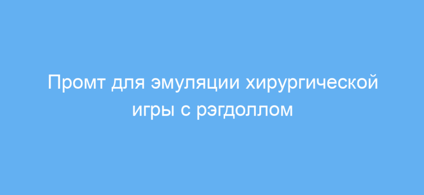 Этот промт предназначен для тех, кто хочет создать интерактивную игру с имитацией хирургической операции на рэгдолле – мягкой кукле с «символическим скелетом». Такой промт полезен разработчикам игр, преподавателям медицины для наглядного тренажёра или просто любителям квестов и ролевых игр с необычным антуражем. Он помогает моделировать процесс лечения простых травм, контролировать состояние «пациента» и создавать динамическую интерактивность внутри диалогового интерфейса нейросети.