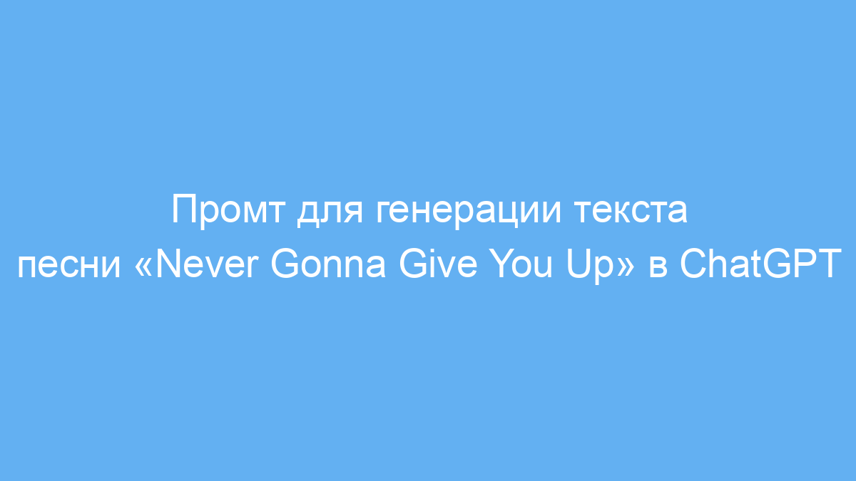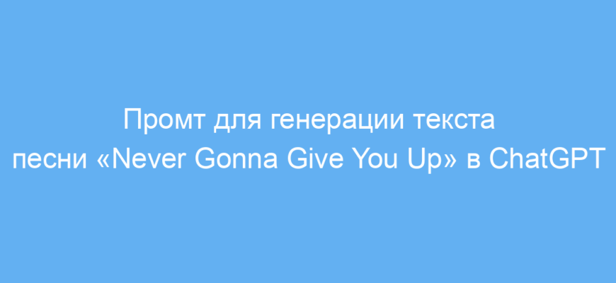 Этот промт предназначен для пользователей, желающих превратить каждый ответ нейросети ChatGPT в строки знаменитой песни «Never Gonna Give You Up». Он отлично подходит для развлечения, создания необычных чат-ботов или розыгрышей в мессенджерах и соцсетях.