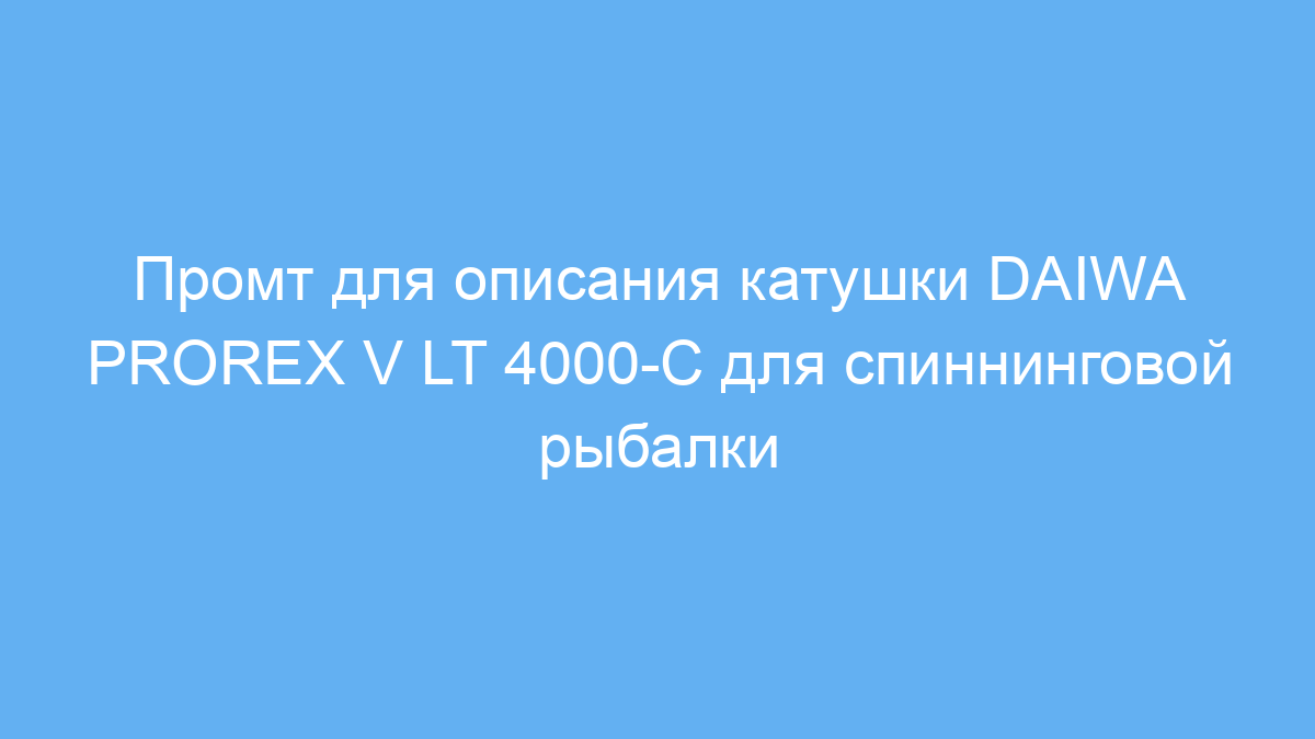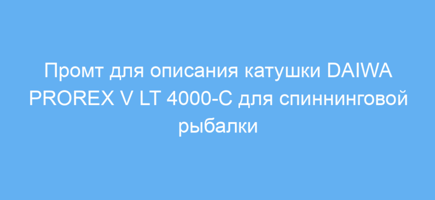 Этот промт предназначен для тех, кто хочет получить подробное и профессиональное описание катушки DAIWA PROREX V LT 4000-C, используемой при спиннинговой рыбалке. Он особенно полезен владельцам рыболовных магазинов, блогерам, начинающим копирайтерам и любителям рыбалки, которым нужно быстро и качественно подготовить текст для сайта, статьи, обзора или каталога.