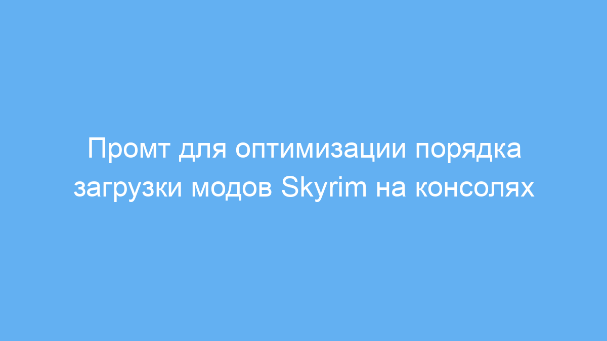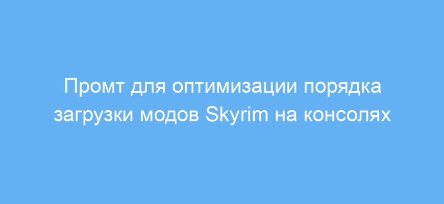 Этот промт создан для игроков Skyrim на консолях, которые хотят правильно упорядочить свои моды. Игроки часто сталкиваются с проблемами: моды конфликтуют между собой, игра может вылетать или тормозить. Правильный порядок загрузки модов помогает минимизировать такие сбои, повысить стабильность и улучшить производительность игры.