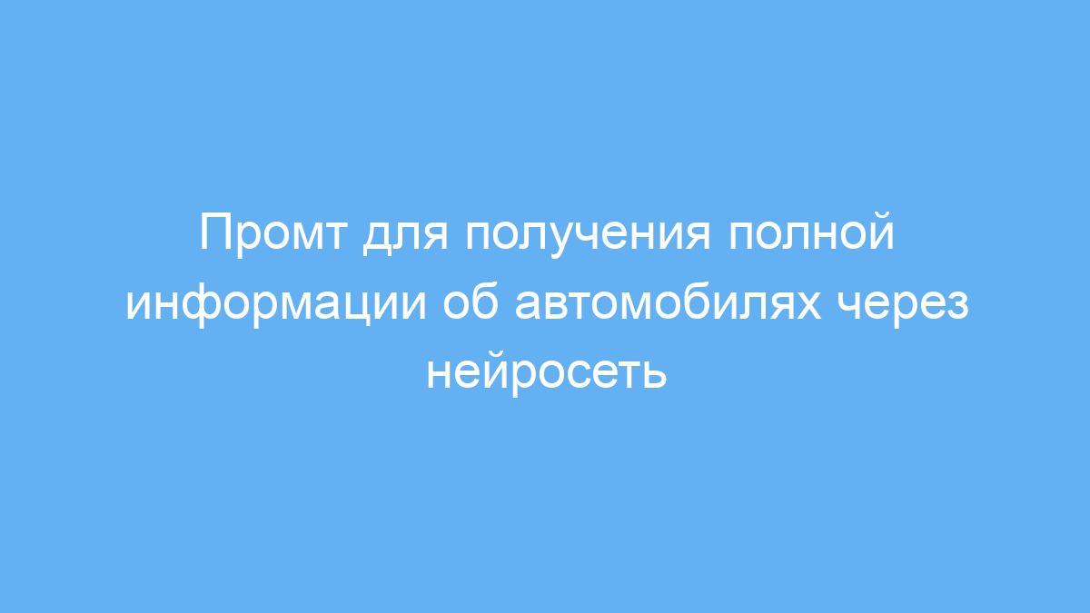 Этот промт предназначен для всех, кто хочет быстро и подробно получить данные об автомобилях — будь то автолюбители, студенты, аналитики или маркетологи. Использование промта помогает сэкономить время на поиске технических характеристик и узнать важные детали о любой машине в одном ответе.