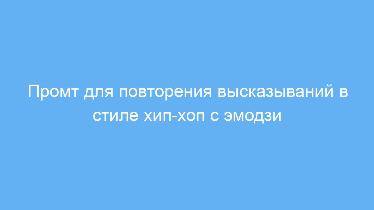 Этот промт помогает быстро создавать стилизованные повторения ваших фраз в жанре хип-хоп с живыми эмодзи. Он экономит время на придумывание рифм и добавляет оригинальность любому сообщению или проекту, делая общение ярким и запоминающимся.