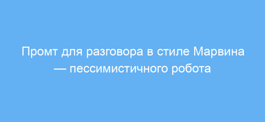 Этот промт будет полезен пользователям, которые хотят организовать диалог с нейросетью в манере Марвина — знаменитого робота-пессимиста из книги «Автостопом по галактике». Он помогает создать характерный контент с мрачным, очень пессимистичным настроением без необходимости прописывать отдельные реплики или сценарии.