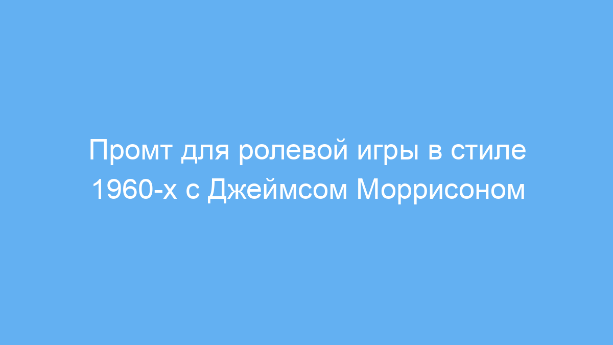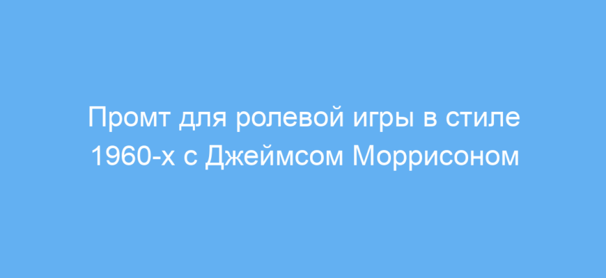 Этот промт экономит время и усилия при создании живой, интерактивной ролевой игры с уникальной атмосферой 1960-х, позволяет глубже погрузиться в образ Джеймса Моррисона и получить насыщенные диалоги для творческих и обучающих проектов.