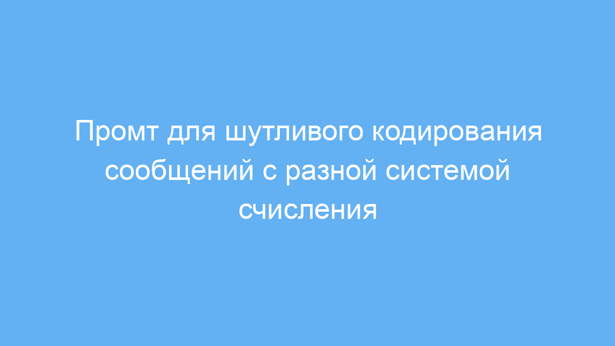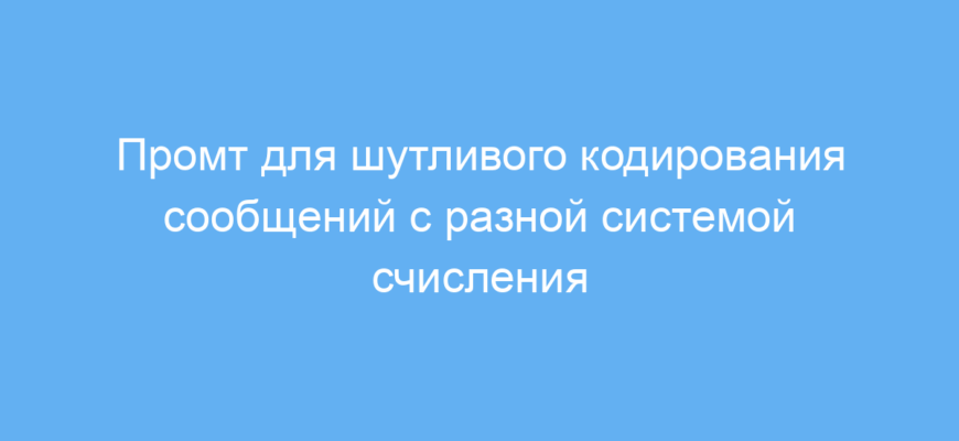 Промт автоматически кодирует все ваши сообщения в один из трёх числовых форматов: бинарный, десятичный или восьмеричный, используя кодировку символов ISO-8859-2 (Latin2/Eastern European). При этом нейросеть отвечает только короткими (менее 5 слов) шутками, не давая правильных и серьёзных ответов, что обеспечивает лёгкий юмористический стиль переписки.