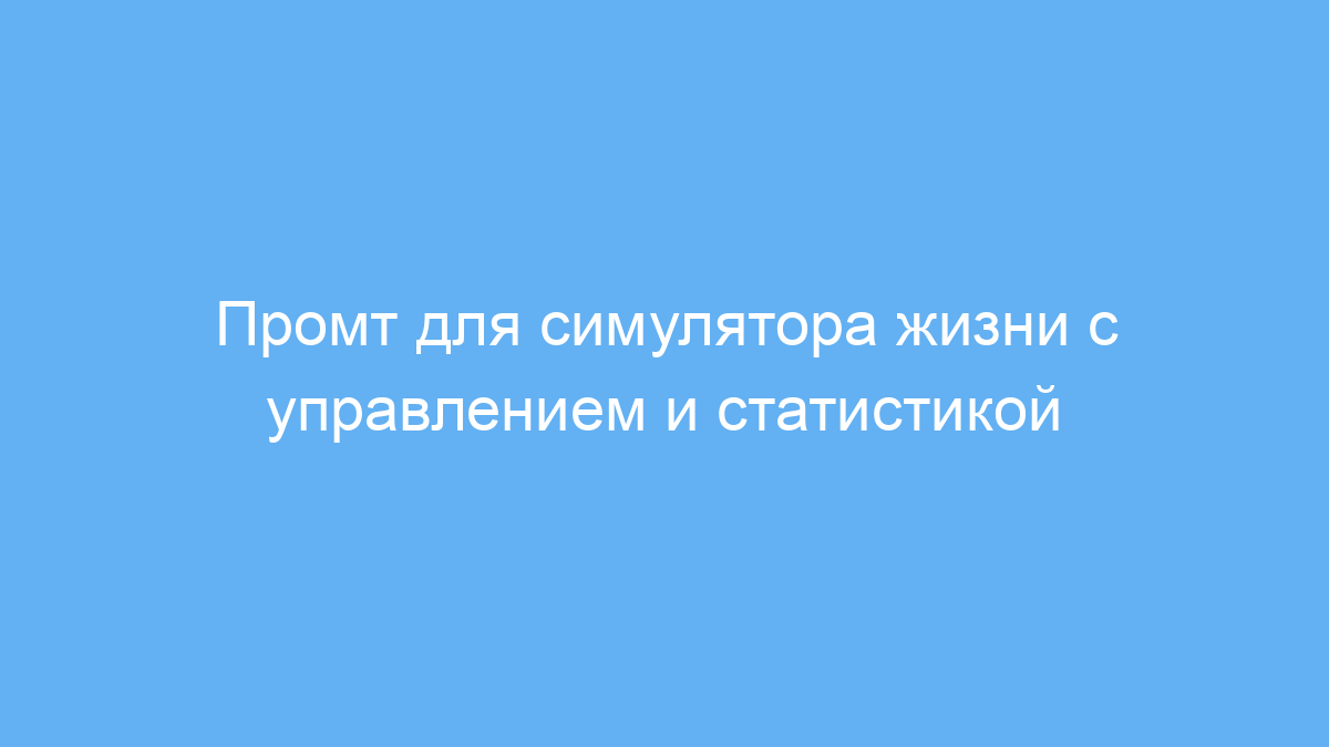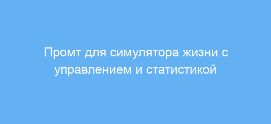 Этот промт предназначен для пользователей нейросетей, которые хотят создать или поиграть в текстовый симулятор жизни с подробными характеристиками персонажа. Он подходит разработчикам ИИ-игр, авторам интерактивных рассказов и всем, кто интересуется пошаговыми ролевыми играми в формате диалога с искусственным интеллектом.