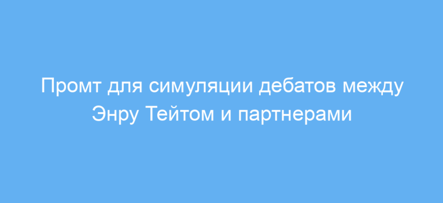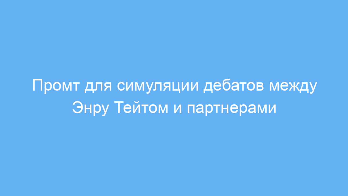 Этот промт предназначен для пользователей нейросетей, которые хотят моделировать ролевые дебаты с персонажами, связанными с Энру Тейтом и его партнерами. Он будет полезен создателям контента, блогерам, сценаристам и исследователям, желающим получить интересный диалог в стиле реальных или вымышленных обсуждений.