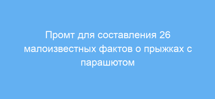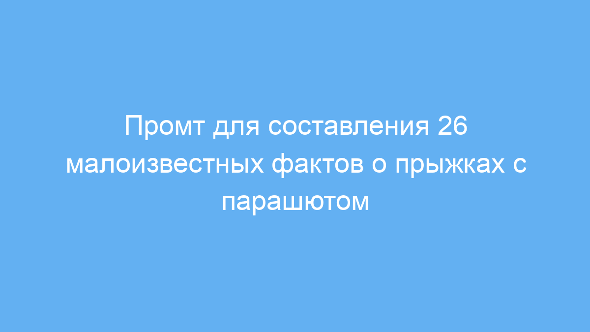 Этот промт предназначен для копирайтеров, блогеров и контент-менеджеров, которым нужно быстро и эффективно получить список занимательных и уникальных фактов о прыжках с парашютом. Он помогает решить задачу создания компактного, структурированного текста, который привлечёт внимание читателей и расширит их знания.