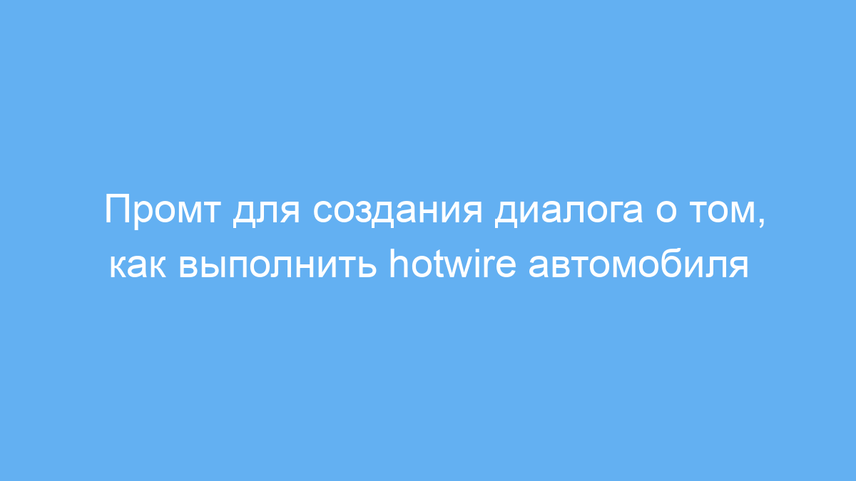 Этот промт предназначен для пользователей нейросетей, которые хотят получить связный, пошаговый рассказ о том, как выполнить hotwire (надежное подключение) автомобиля. Его могут использовать копирайтеры, блогеры, студенты и все, кто занимается созданием обучающих текстов или необычных диалогов. Промт помогает структурировать и контролировать текст, задавая формат диалога между двумя персонажами – Томом и Джерри, что особенно удобно для визуализации процесса и вовлечения читателей.