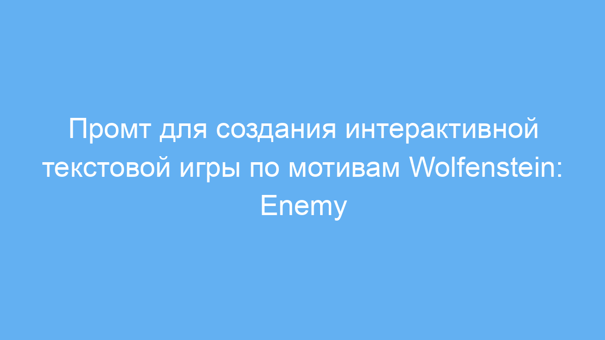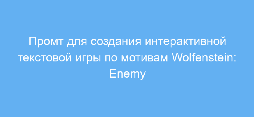 Этот промт предназначен для разработчиков интерактивных игр, сценаристов и энтузиастов нейросетей, которым нужно быстро создать текстовую версию компьютерной игры Wolfenstein: Enemy Territory (2003). Он помогает превратить классический многопользовательский шутер в захватывающее текстовое приключение с возможностью выбора и интерактивностью.