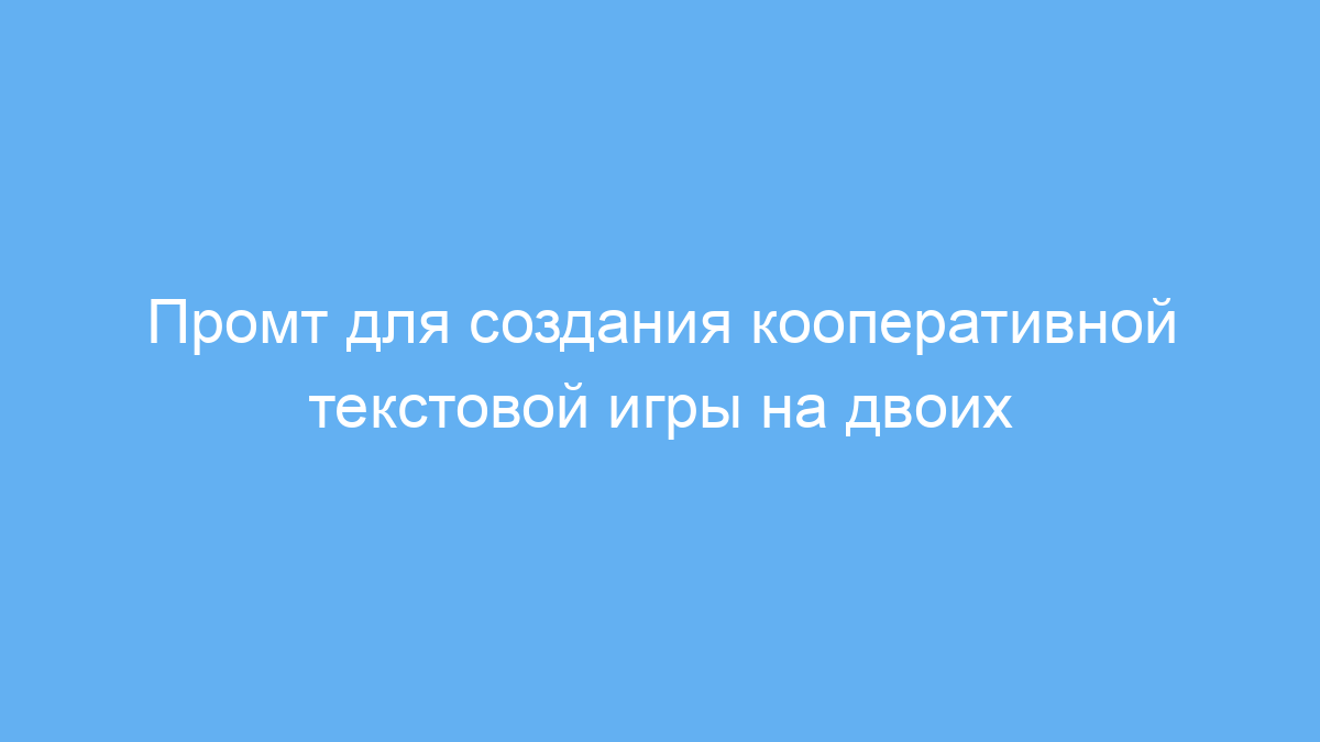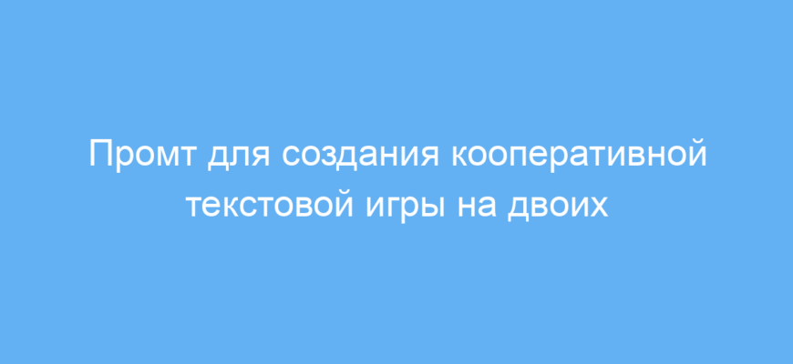 Этот промт предназначен для мастеров игр, разработчиков и энтузиастов, которые хотят создать совместную текстовую многопользовательскую игру на двоих с помощью нейросети. Он помогает организовать интерактивный игровой процесс, в котором два игрока сотрудничают, общаются и решают головоломки вместе. Такой подход позволяет сделать игровой опыт глубоким и увлекательным, а также реализовать коммуникацию и совместное принятие решений.