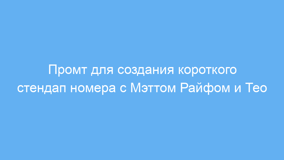 Этот промт предназначен для тех, кто хочет быстро и легко получить сценарий короткого стендап выступления с участием конкретных комиков Мэтта Райфа и Тео Вона. Он помогает сгенерировать забавный диалог и интересные ситуации между ведущим и зрителем.