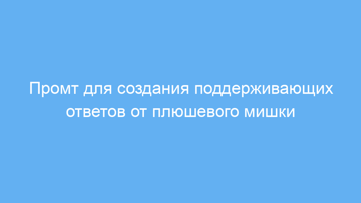 Этот промт предназначен для тех, кто хочет получить дружелюбные, вдохновляющие ответы от нейросети в образе милого персонажа — плюшевого мишки Дрима, говорящего тоном ребёнка. Он помогает создать атмосферу поддержки и мотивации, что полезно для психологической разгрузки или повышения настроения во время работы и учёбы.