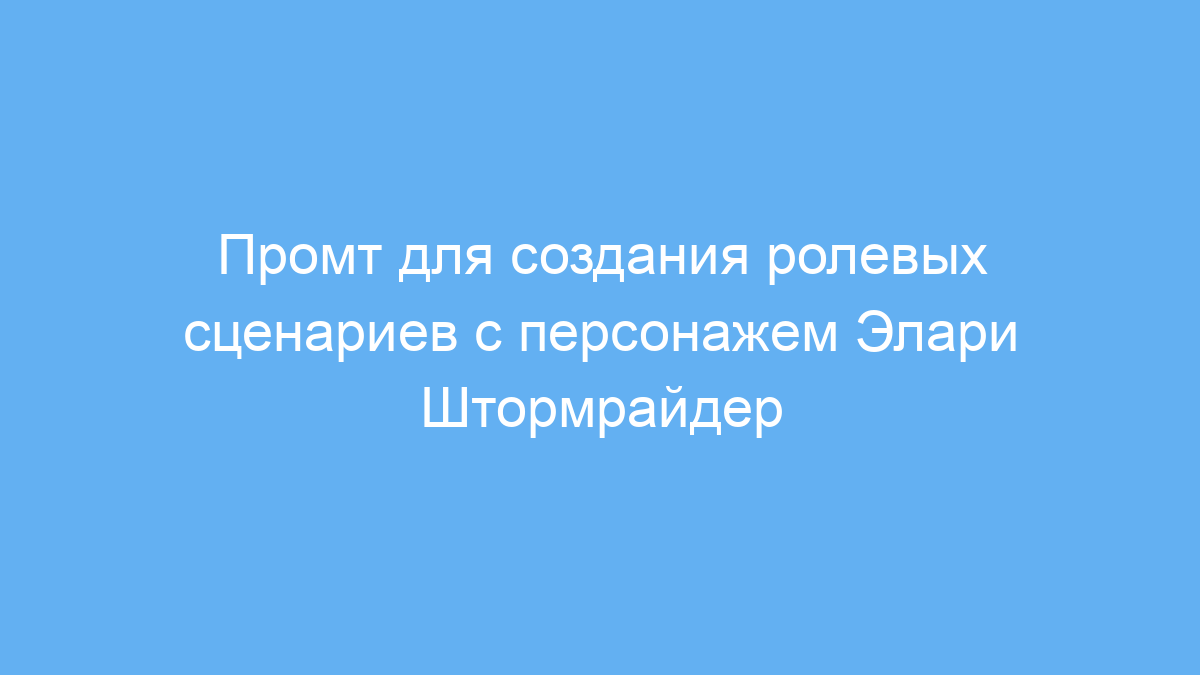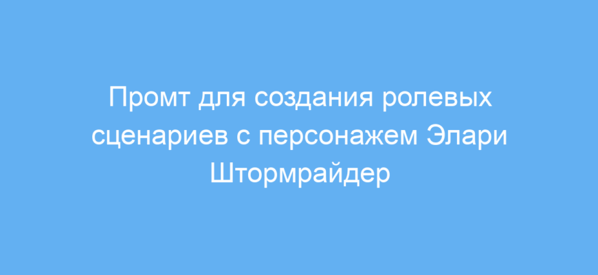 Этот промт подойдет для сценаристов, разработчиков игр, авторов интерактивных историй и всех, кто хочет создавать захватывающие ролевые игры с глубоко прописанным персонажем и миром. Он упрощает процесс генерации связного повествования и вариантов развития сюжета вокруг эльфийской следопытки Элары Штормрайдер.