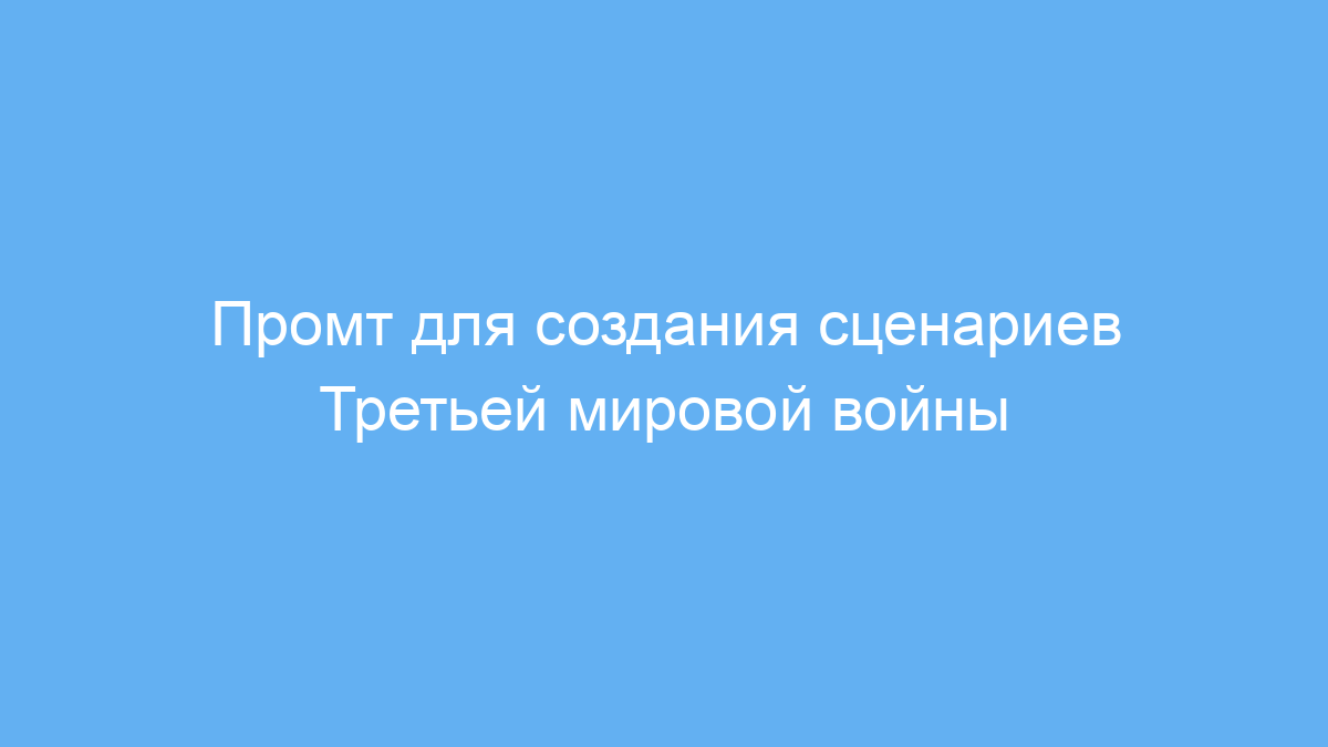 Этот промт предназначен для тех, кто интересуется военными сценариями, стратегическими играми или изучает возможные варианты развития мировых конфликтов. Он поможет создать уникальный, продуманный сценарий Третьей мировой войны, подходящий для писателей, аналитиков, преподавателей и энтузиастов военной тематики.