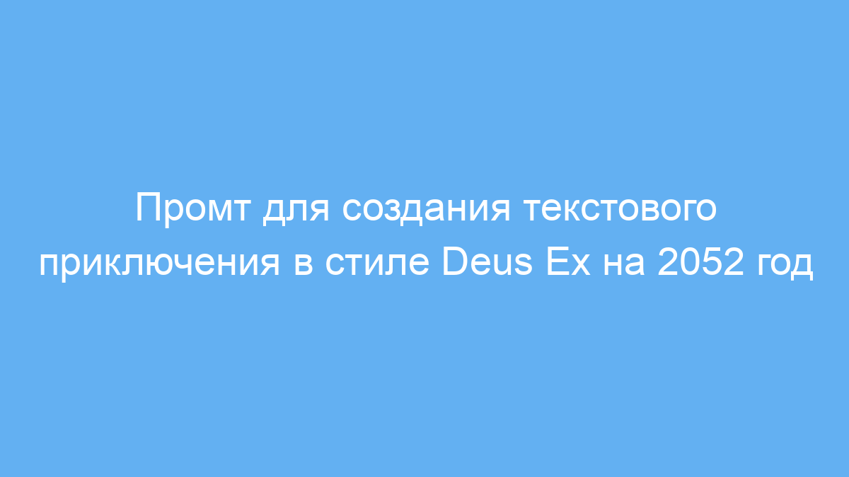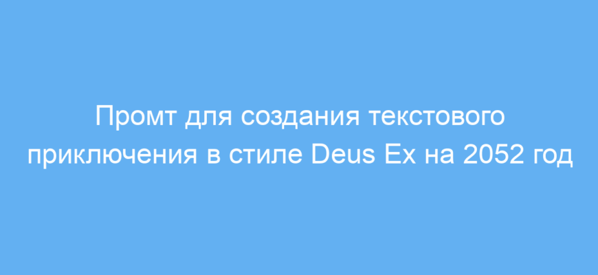 Этот промт предназначен для разработчиков интерактивных текстовых игр и любителей киберпанковских историй, которые хотят быстро создать атмосферное приключение в стиле Deus Ex. Он помогает сгенерировать сюжет, диалоги и описания, используя подробный и эмоциональный стиль повествования от лица интеллигентного рассказчика.