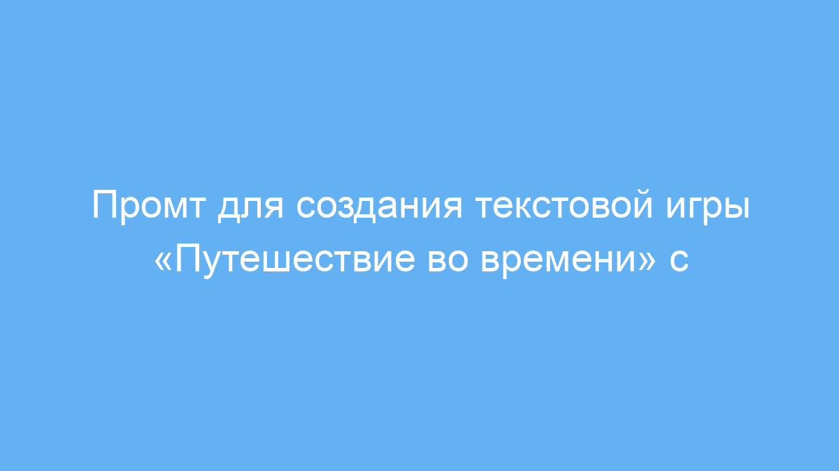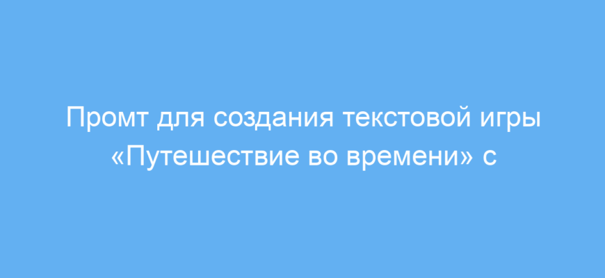 Название игры: «Хроно-страж: Исторический квест» Описание мира: Вы стоите в контролируемом центре времени, где изучаете ключевые эпохи, чтобы предотвратить парадокс. Проблема: Временны́е линии пересекаются и меняются, угрожая исторической целостности. ... Команды и игровой процесс — аналогично основному промту. |