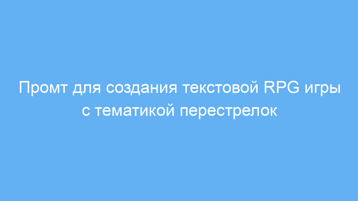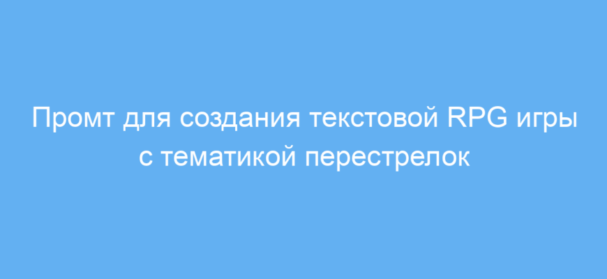 Этот промт предназначен для разработчиков, создателей контента и энтузиастов, которые хотят быстро получить готовый скрипт текстовой RPG игры с акцентом на перестрелки и ролевую механику, вдохновлённую D&D 5-й редакции. Он помогает сгенерировать интерактивный сюжет, управляемый нейросетью, в котором игроки могут создавать персонажа, выбирать оружие, проходить приключения и участвовать в пошаговых боях.