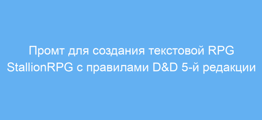 Данный промт позволяет легко и быстро развернуть сложную текстовую RPG с глубокой механикой D&D 5-й редакции в интерактивном формате. Это значительно экономит время разработки и позволяет создавать увлекательные миры с богатым геймплеем для разных игроков, не начиная с нуля и без глубоких технических знаний.