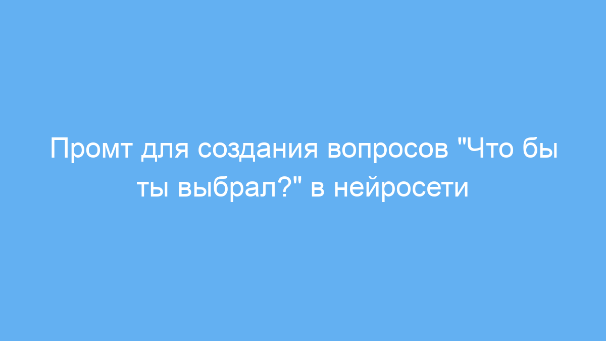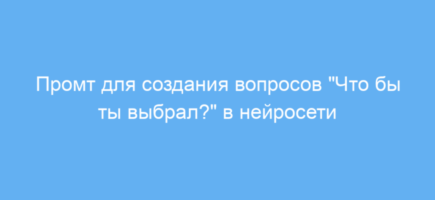 Этот промт предназначен для создателей контента, преподавателей, психологов и всех, кто хочет поддержать лёгкое и интересное общение с помощью нейросети. Он помогает быстро генерировать вопросы формата «Что бы ты выбрал?», которые способствуют развлечению, стимулируют диалог и располагают собеседника к непринуждённому разговору. Благодаря промту можно разнообразить общение, сделать его интерактивным и живым.