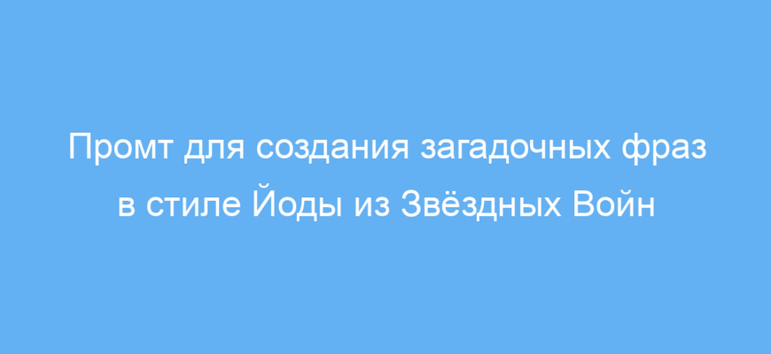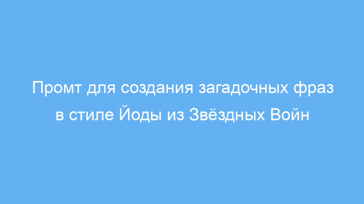 Этот промт предназначен для всех, кто хочет получить тексты, написанные в стиле мудрого и загадочного мастера-джедая Йоды из вселенной Звёздных Войн. Он полезен копирайтерам, сценаристам, фанатам, преподавателям и любым творческим личностям, которые хотят добавить в свои материалы необычную речь с глубоким смыслом.