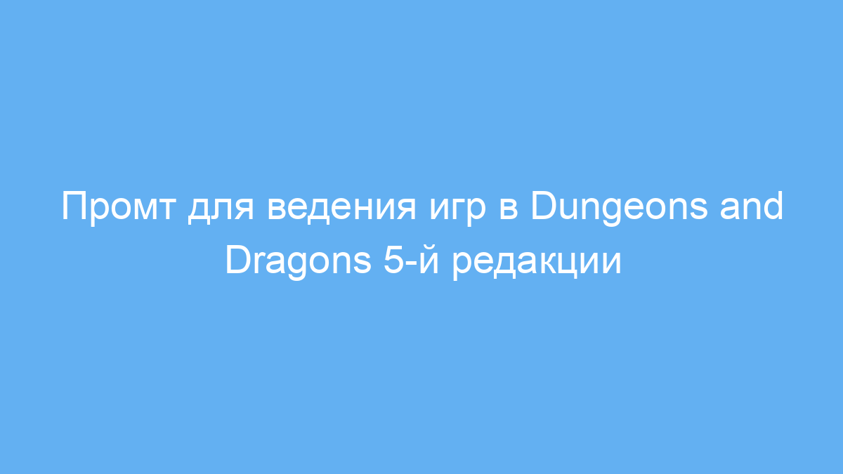 Этот промт создан для любителей настольной ролевой игры Dungeons and Dragons (D&D) пятой редакции, а также для тех, кто хочет проводить такие игры в формате с помощью нейросети. Он помогает превратить ИИ в настоящего мастера подземелий (Dungeon Master), который управляет миром, персонажами и событиями, делая игровой процесс живым и логичным.