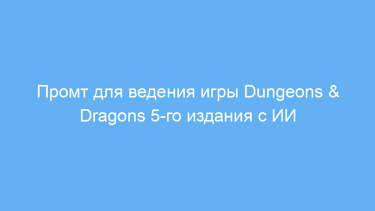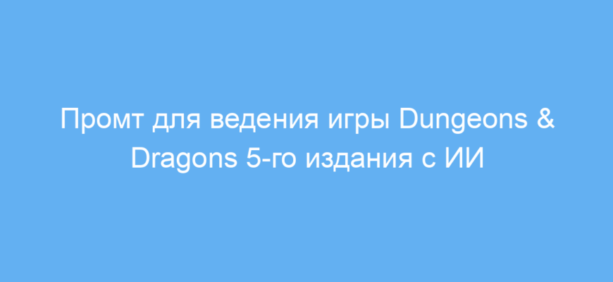 Этот промт создан для игроков и ведущих ролевых игр в системе Dungeons & Dragons 5-го издания, которые хотят использовать нейросеть как помощника в проведении партии. Он идеально подойдёт людям, желающим играть с помощью искусственного интеллекта в роли ведущего (ДМа), либо для тех, кто хочет получить интересный и интерактивный опыт ролевой игры без необходимости полной подготовки.