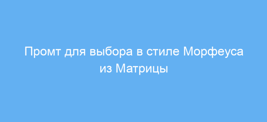 Данный промт создан для тех, кто хочет получить интерактивный сценарий в стиле культового фильма «Матрица». Он помогает пользователям сделать осознанный выбор — «красная таблетка», «синяя таблетка» или продолжить взаимодействие с чат-ботом. Такой подход полезен для развлечения, креативных играх с искусственным интеллектом и создания необычных диалогов. Промт мотивирует пользователя подумать над последствиями каждого выбора, что подходит для тренировки критического мышления или проведения ролевых онлайн-игр.