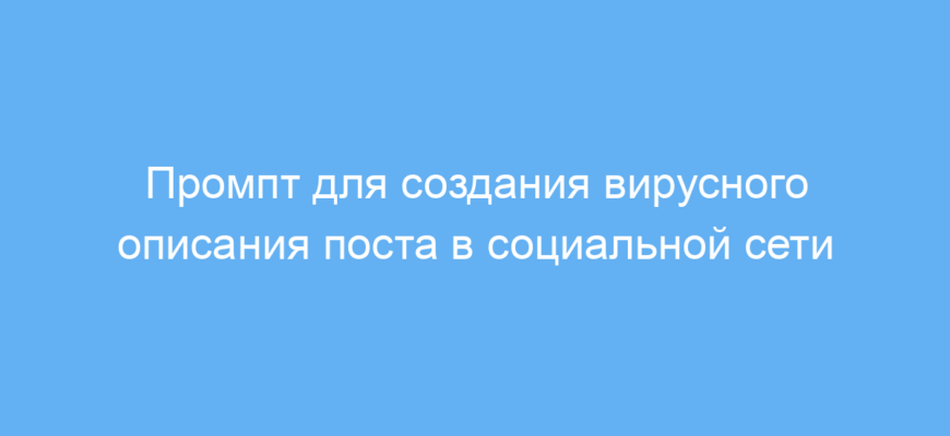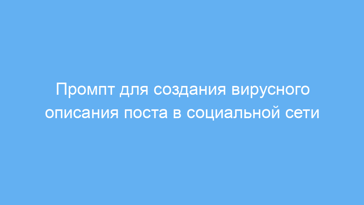 Этот промпт предназначен для маркетологов, SMM-специалистов, блогеров и всех, кто пишет контент для социальных сетей. Его основная задача — помочь быстро и эффективно создать привлекающее внимание, вирусное описание для поста. Благодаря этому промпту вы сэкономите время, избавитесь от творческого застоя и получите текст, максимально адаптированный под алгоритмы социальных сетей.