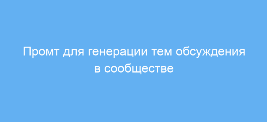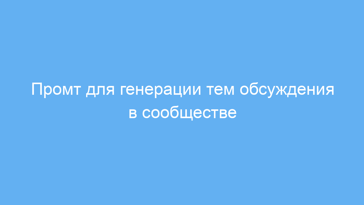Этот промт создан для тех, кто ведёт сообщества, блоги или группы в социальных сетях и хочет регулярно получать свежие идеи для обсуждения с учётом интересов своей аудитории. Он помогает быстро сгенерировать пять увлекательных тем с кратким описанием, что значительно облегчает планирование контента и поддержание активности в вашем сообществе.