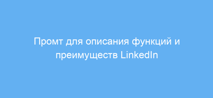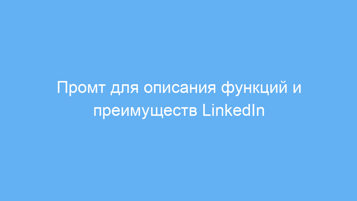 Этот промт создан для копирайтеров, контент-менеджеров и маркетологов, которые хотят получить структурированное и информативное описание социальной сети LinkedIn. Он поможет быстро создать текст, раскрывающий основные возможности LinkedIn — для профессионального нетворкинга, развития карьеры, поиска работы и продвижения бизнеса.