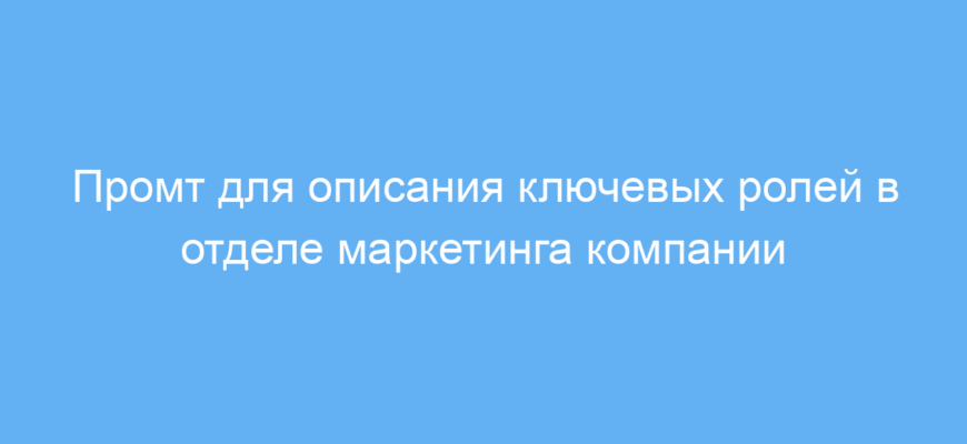 Данный промт предназначен для руководителей, HR-специалистов, маркетологов и всех, кто хочет быстро и понятно описать основные роли в отделе маркетинга компании. Он помогает структурировать информацию о ключевых профессионалах, их функциях и навыках, что облегчает создание вакансий, организацию команды или обучение.