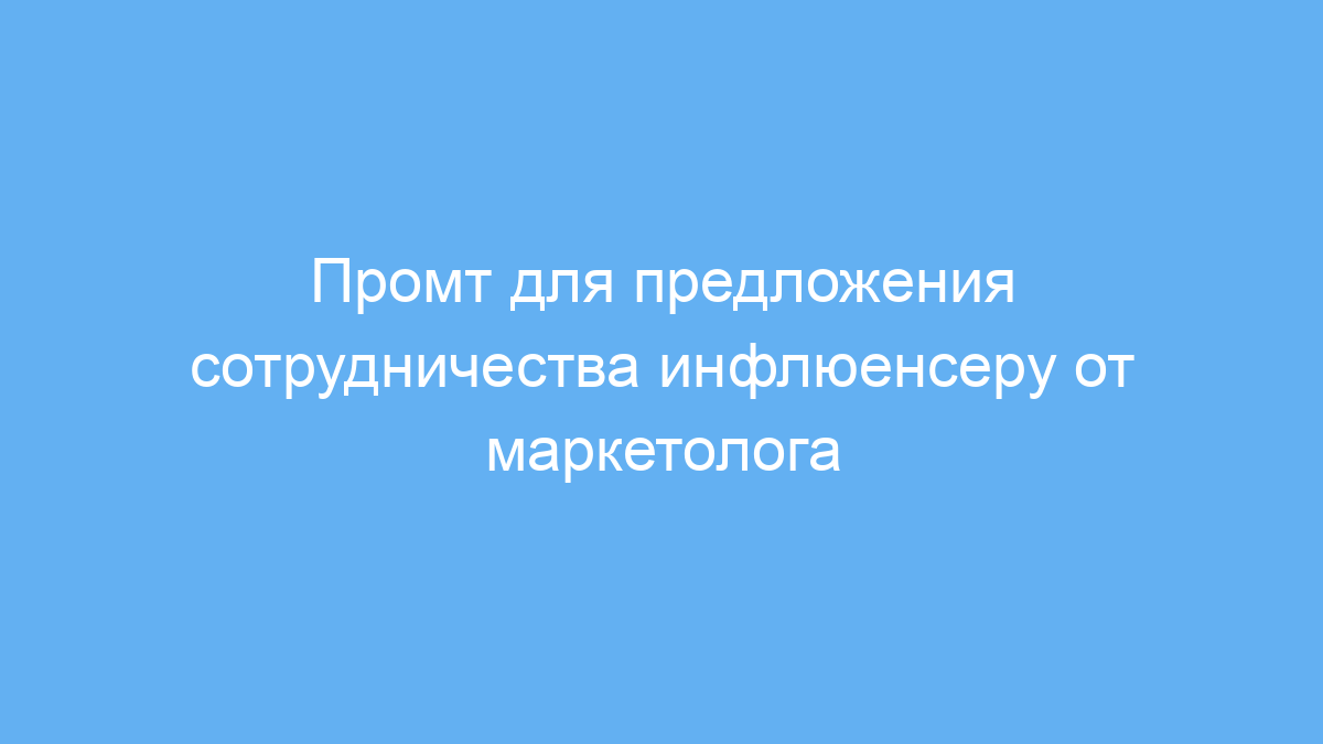 Этот промт предназначен для маркетологов по контенту и специалистов по digital-маркетингу, которым нужно наладить первое общение с инфлюенсерами. Часто у маркетолога нет времени или навыков для написания персонализированных и в то же время уважительных сообщений, в которых четко обозначены выгоды сотрудничества. Такой промт позволяет быстро сформировать привлекательное и индивидуальное предложение, учитывая сферу деятельности инфлюенсера, продукт и целевую аудиторию бренда.