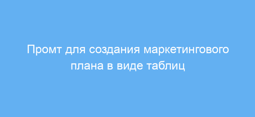 Промт работает, запрашивая у нейросети создать 10 таблиц с разными элементами маркетингового плана. Для этого нужно заполнить входные данные — характеристики бренда, продукты, целевую аудиторию, цели и технические требования. В ответе нейросеть формирует структурированные таблицы, которые можно сразу использовать для презентаций, обсуждений и отчетности.