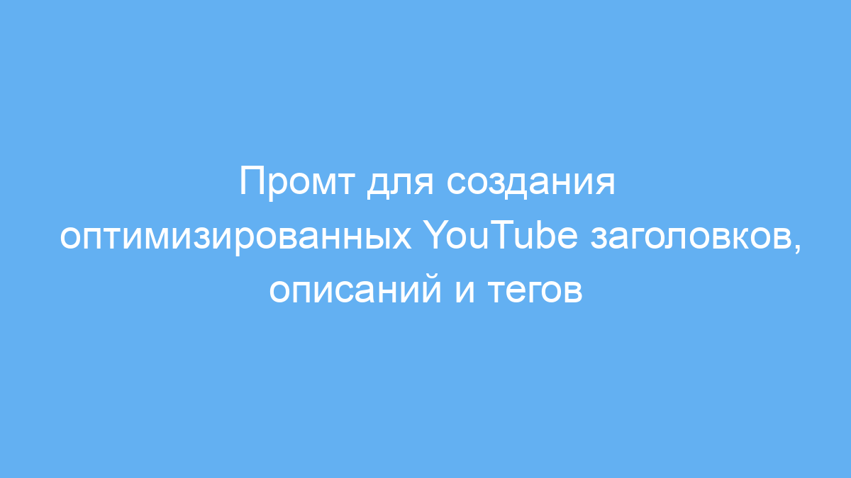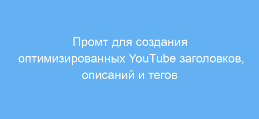 Данный промт предназначен для авторов видео, маркетологов и создателей контента, которые хотят быстро и качественно создать привлекательные заголовки, информативные описания и эффективные теги для видео на YouTube.