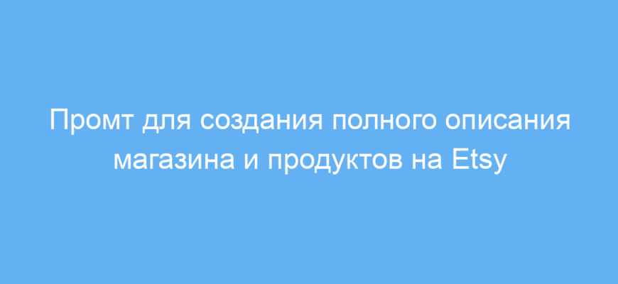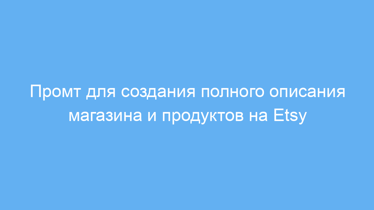Этот промт предназначен для менеджеров магазинов Etsy, маркетологов, копирайтеров и владельцев небольших интернет-магазинов. Он помогает быстро и качественно создать полный набор текстов: описание магазина, рекламное объявление, заголовки и описания товаров, а также SEO-теги и материалы для продвижения в соцсетях.