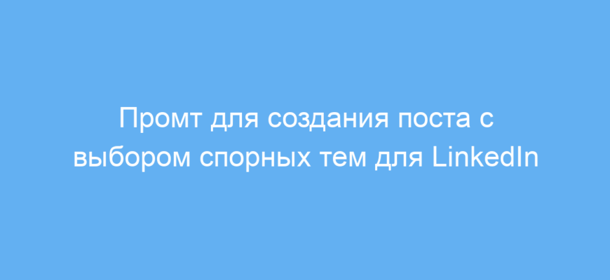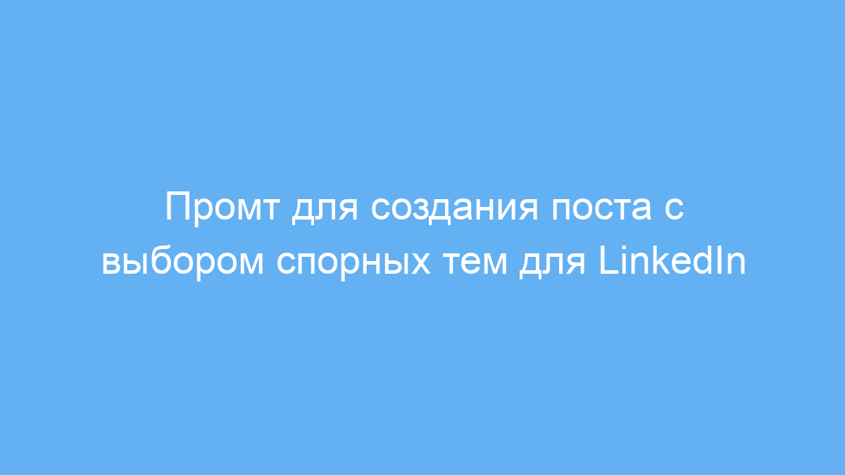 Этот промт предназначен для специалистов и экспертов, которые хотят быстро и легко создать привлекательный пост для LinkedIn, выражая своё мнение по актуальным и спорным вопросам. Он помогает сэкономить время и структурировать контент таким образом, чтобы привлечь внимание и вызвать обсуждение.