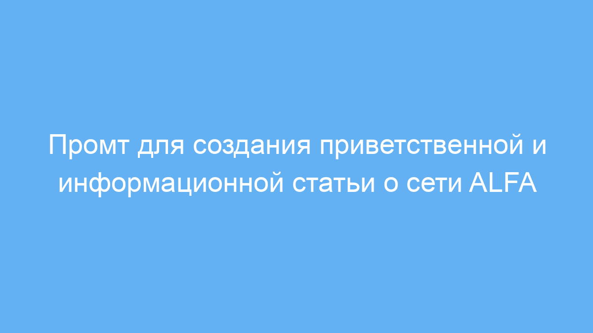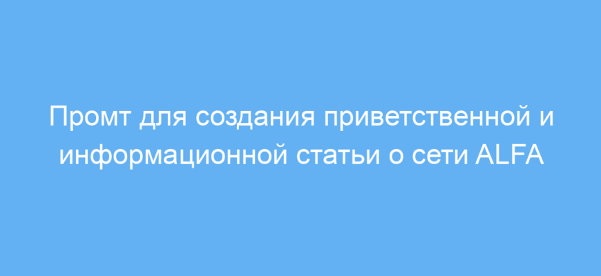Этот промт решает задачу систематизации информации: с его помощью удобно собрать в одном тексте все важные аспекты проекта ALFA, сделать акцент на выгодах для пользователей и стимулировать рост аудитории. Пользователь вводит промт в нейросеть — и получает готовое содержательное приветствие, которое можно использовать для сайта или маркетинговых материалов.