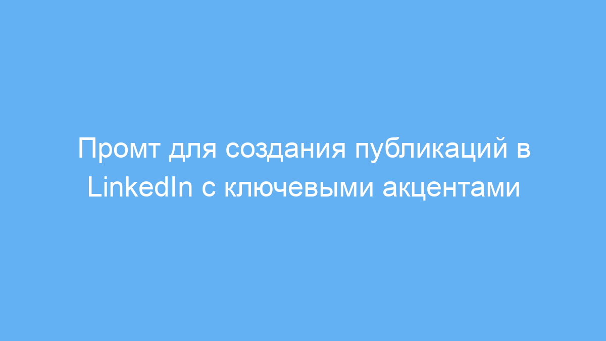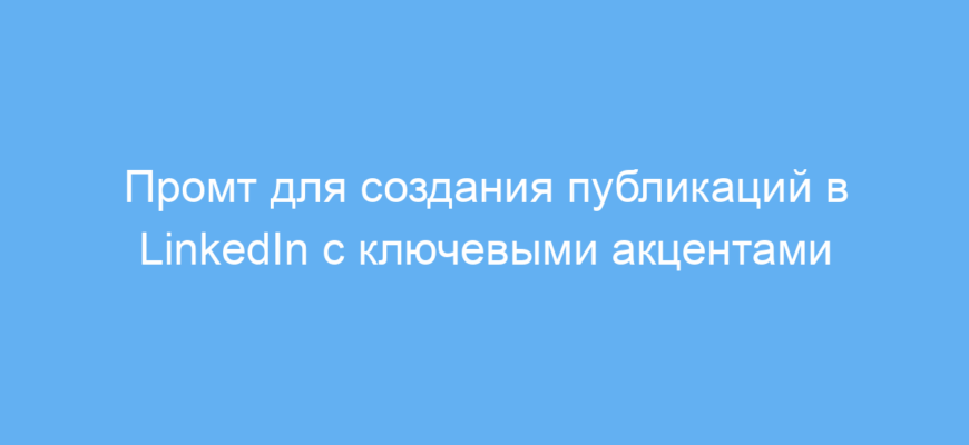 Этот промт предназначен для маркетологов, SMM-специалистов, контент-менеджеров и всех, кто ведёт профессиональные страницы в LinkedIn. Он помогает быстро создавать качественные публикации, подчеркивающие важные моменты вашего бренда, продукта или услуги.