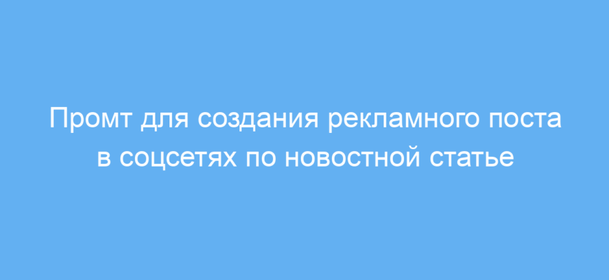 Этот промт позволяет быстро и эффективно создавать связанный с новостями качественный рекламный контент для социальных сетей. Он экономит время на продумывание текста и помогает правильно представить своё предложение в контексте актуальной информации, что повышает интерес потенциальных клиентов.