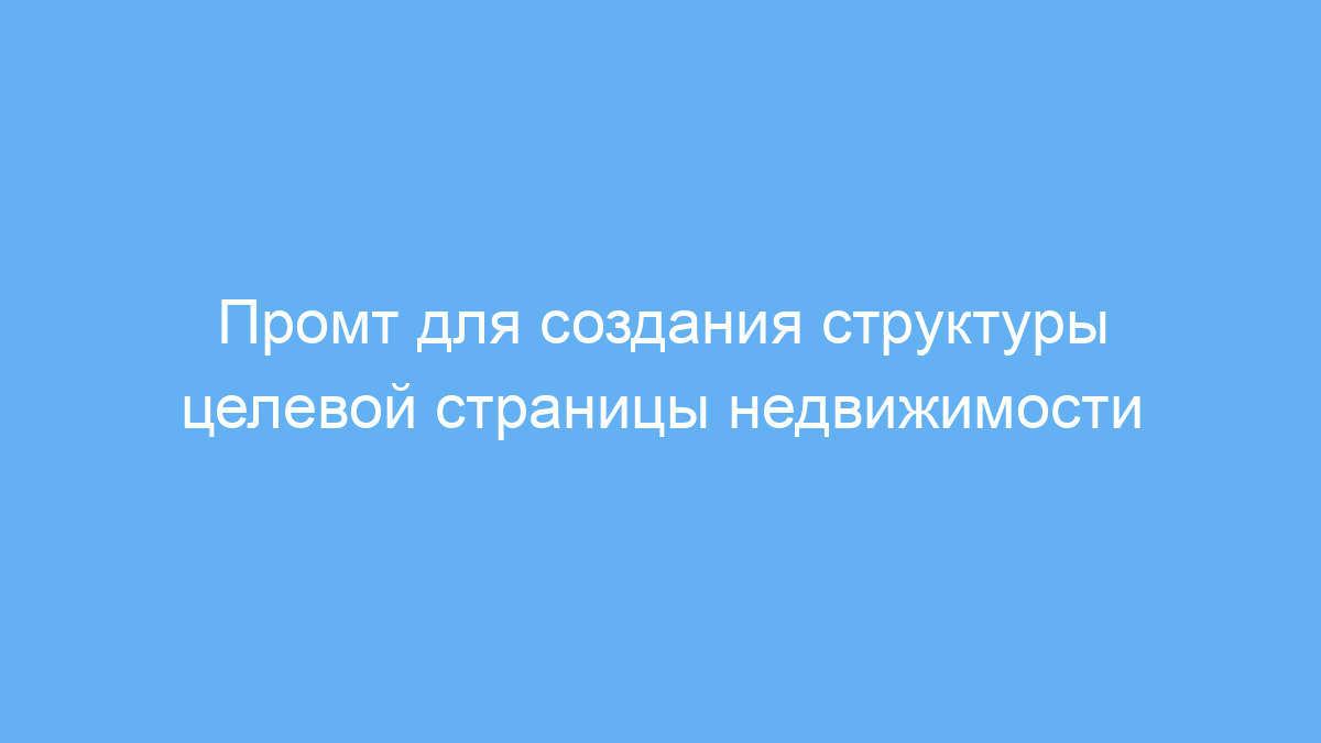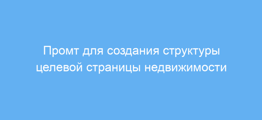 Этот промт предназначен для специалистов в области SEO, веб-дизайна и UI/UX, которые создают целевые страницы для сайтов о недвижимости. Он помогает сформировать продуманную структуру страницы, содержащую всю важную информацию, необходимую потенциальным клиентам для принятия решения о покупке или использовании услуги.