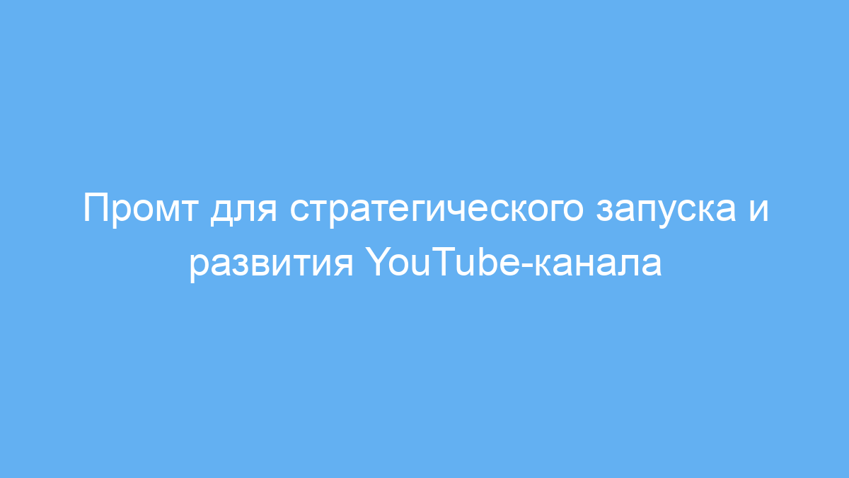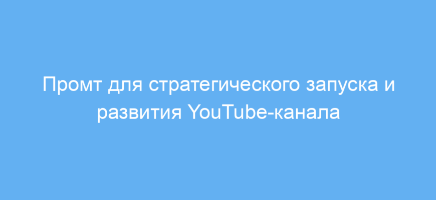 Этот промт предназначен для всех, кто хочет создать успешный и стабильный YouTube-канал. Он будет полезен начинающим блогерам, маркетологам, SMM-специалистам, а также предпринимателям, желающим продвигать свой бизнес через видео. Промт решает задачу комплексной подготовки к запуску канала: от выбора ниши и позиционирования до планирования контента и SEO-оптимизации видео. Благодаря структурированным шагам он помогает избежать хаоса и ошибок на старте, а также создаёт чёткий план для устойчивого роста аудитории.