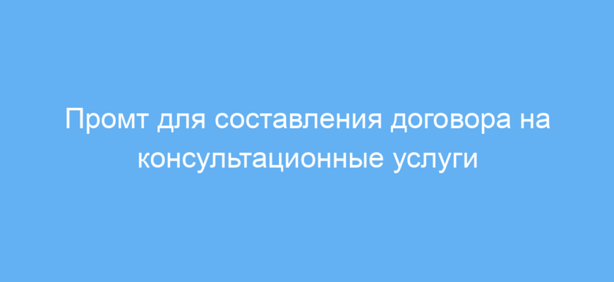 Этот промт предназначен для юристов, предпринимателей и специалистов, которым нужно быстро подготовить образец договора на консультационные услуги. Он помогает создать документ, который чётко описывает условия сотрудничества между компанией и консультантом.