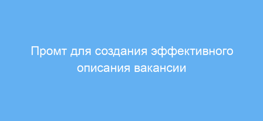 Данный промт помогает быстро и грамотно создавать структурированные описания вакансий, что экономит время HR-специалистов и делает вакансию привлекательной для кандидатов. Он систематизирует ключевую информацию и позволяет получать чёткие тексты, подходящие для публикации на сайтах и в соцсетях.