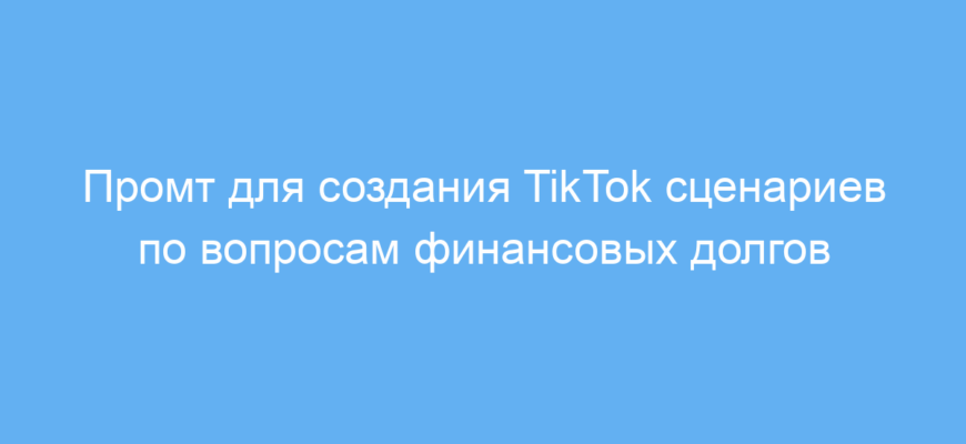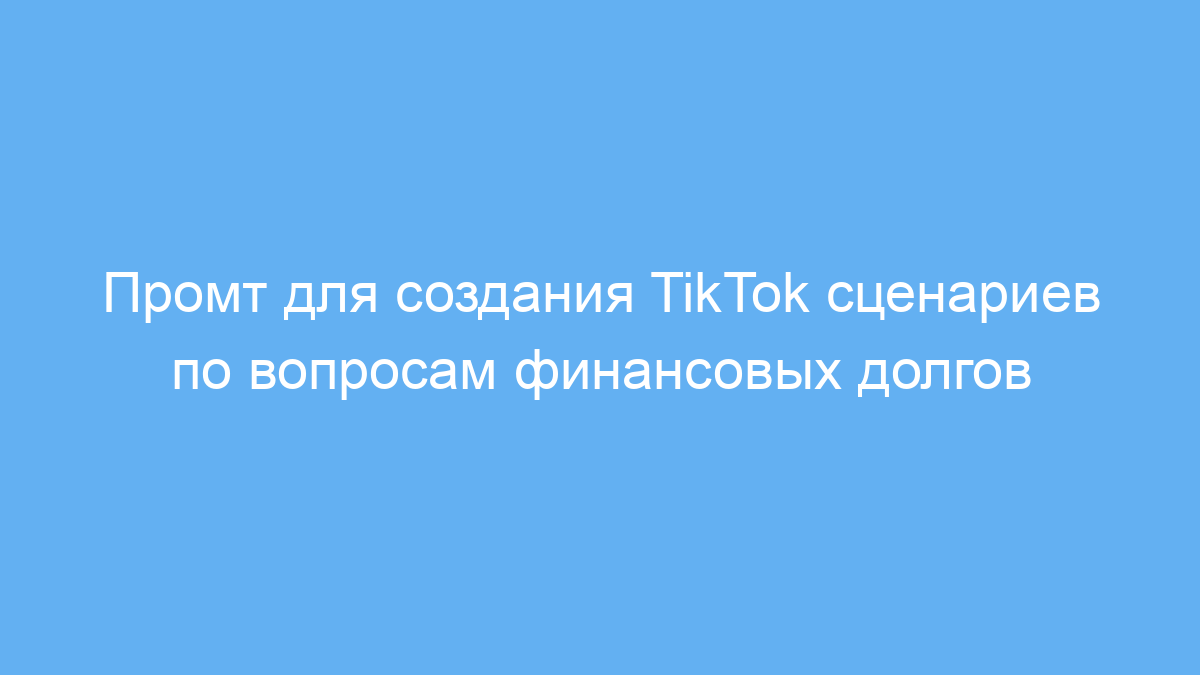 Этот промт предназначен для юристов, специалистов по финансовым вопросам и маркетологов, которые создают контент о финансовых долгах, юридических нюансах и практических решениях для аудитории в TikTok. Использование промта помогает быстро генерировать профессиональные ответы на вопросы клиентов по финансовым долгам и автоматически превращать их в короткие сценарии для видеороликов продолжительностью 25-35 секунд — именно такого формата, который актуален для социальной сети TikTok.