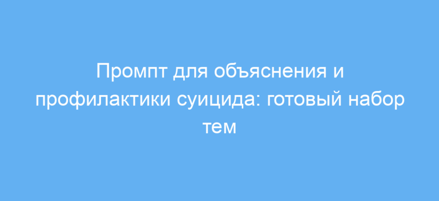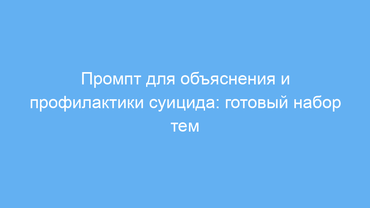 Этот промпт предназначен для специалистов здравоохранения, психологов, педагогов и всех, кто занимается вопросами профилактики суицида. Он помогает структурировано и доступно объяснять сложную тему предупреждения суицида, используя готовый список важных аспектов — от определения понятия до ролей системы здравоохранения.