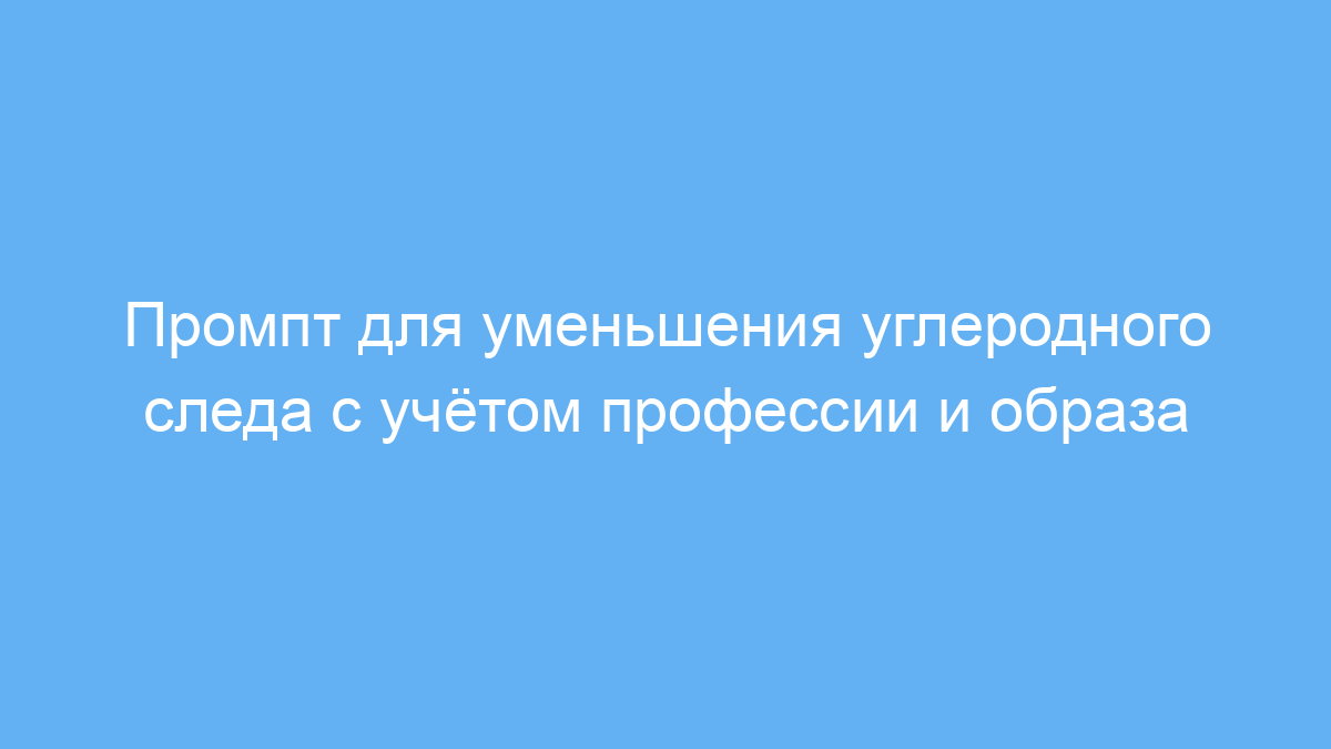 Этот промпт предназначен для тех, кто заинтересован в снижении собственного или корпоративного углеродного следа — влияния на изменение климата через выбросы парниковых газов. Он будет полезен и специалистам по экологии, и простым пользователям, которые хотят получить конкретные рекомендации с учётом своей профессии, возраста и ежедневной деятельности.