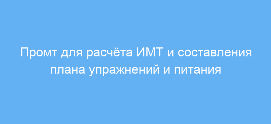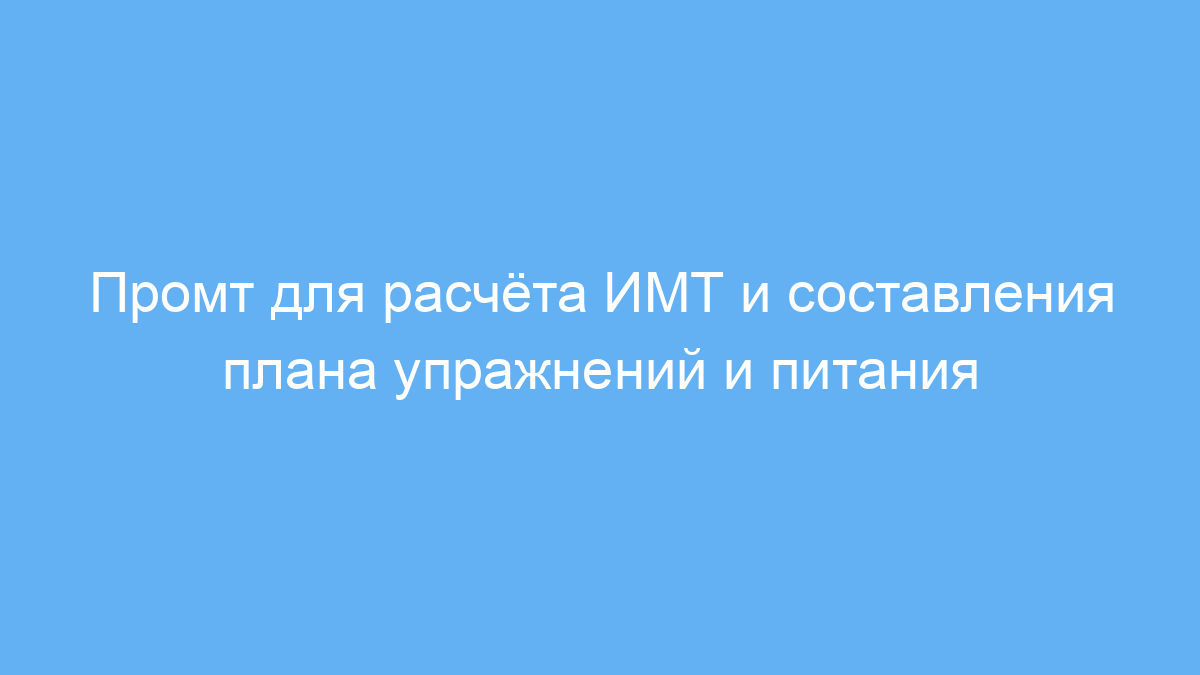Этот промт предназначен для людей, которые хотят получить персонализированную помощь в вопросах здоровья и образа жизни. Он помогает рассчитать индекс массы тела (ИМТ) с понятным объяснением, а также создаёт два плана — по упражнениям и по ежедневному питанию — с учётом индивидуальных параметров и целей.